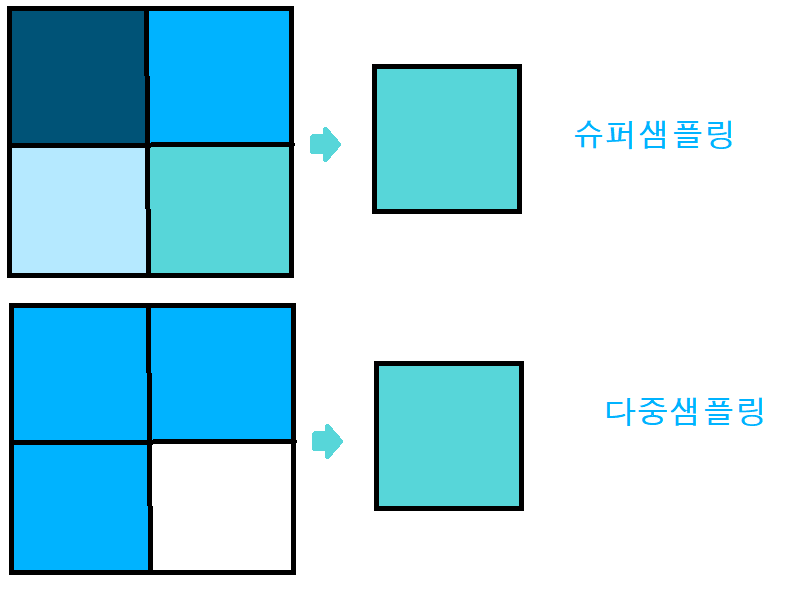 - 초과 표본화 (슈퍼샘플링) : 후면버퍼와 깊이버퍼를 화면 해상도 보다 4배 크게 잡고, 후면버퍼에 4배 크기의 해상도에서 랜더링 한다. 이미지를 화면에 제시할때가 되면 후면버퍼를 원래크기의 버퍼로 환원한다. 그과정에서 4픽셀블록의 네 색상의 평균을 해당하는 픽셀의 최종 픽셀로 사용한다.