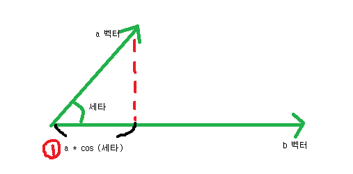 내적의 정의는 ① * b의 크기 이다. 메인 방향 벡터에 도움을 주는 만큼의 힘을 곱한것이 내적의 정의 이다.