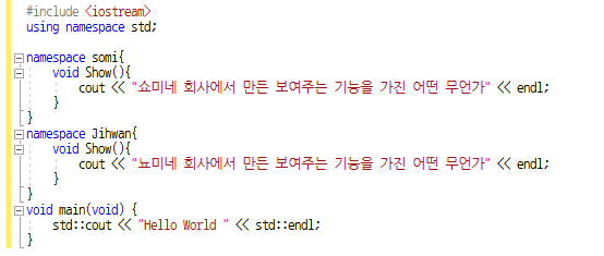 #include 외부에 선언된 함수나 상수 등을 사용하기 위해서 헤더파일의 내용을 현재파일에 포함할때 사용 #define 은 함수나 상수를 단순화해주는 매크로를 정의할 때 사용 iostream input, output의 약자이며 라이브러리이다. C 프로그래밍 언어의 stdio.h와 같은 역할을 한다. namespace c++프로그램을 작성할때 발생하는 이름에 대한 충돌을 방지 같은 문법이 두개이면 컴퓨터는 컴파일 에러(컴파일단계에서 문법에 오류가 있을 경우 빌드하지 못할때)를 유발한다. c++프로그램 표준구성 요소인 클래스, 함수, 변수 등은 std라는 이름공간에 저장되어있다. 따라서 c++프로그램에서 표준헤더파일인 iostream 내의 정의를 사용하려면 다음과같이 사용해야한다. 1 using names..